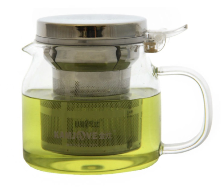 Стеклянный чайник с металлической колбой и крышкой. Крышка присоединена к колбе и открывается легким нажатием пальца. Сама заварочная колба плотно «сидит» в корпусе чайника, благодаря металлическим «ушкам», расположенным на ней. Подобная конструкция точно не разочарует вас разбитыми деталями чайника (которые потом сложно найти отдельно в продаже), но все же позволит наслаждаться видом настоя в стеклянном корпусе. Заварочная колба полностью вынимается, что облегчает уход за чайником и позволяет использовать стеклянный корпус в качестве кружки или чахая (сливника).