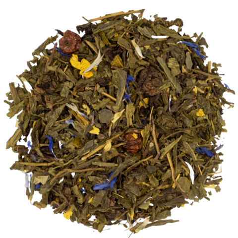 Неожиданное сочетание китайских зеленых чаев Сенча и Улун прекрасно гармонирует в этой смеси со вкусом отборных экзотических фруктов и сливочной ванилью, раскрывая богатую и насыщенную палитру вкуса и аромата. Бордовые пятна смородины и желто-синие штрихи подсолнечника и василька подчеркивают красоту этой поистине королевской смеси. Заваривать при 75-85° в течении 1-2 мин.